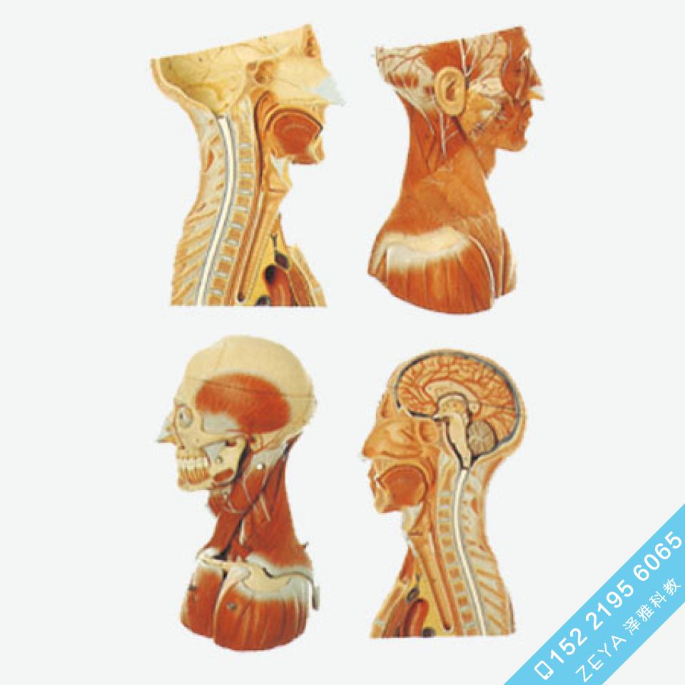 ■该模型由头颈部正中矢状切面(左侧半块可向上移动)、颅顶、脑正中矢状切面、眼、左侧半胸锁乳突肌、三角肌、胸大肌、斜方肌、下颌骨、锁骨等19个部件组成,并显示头顶部正中矢状切面、颅顶、颅底、大脑半球、间脑、小脑和脑干各个部分,以及脑神经和脑血管等结构,共有190个部位指示标志。